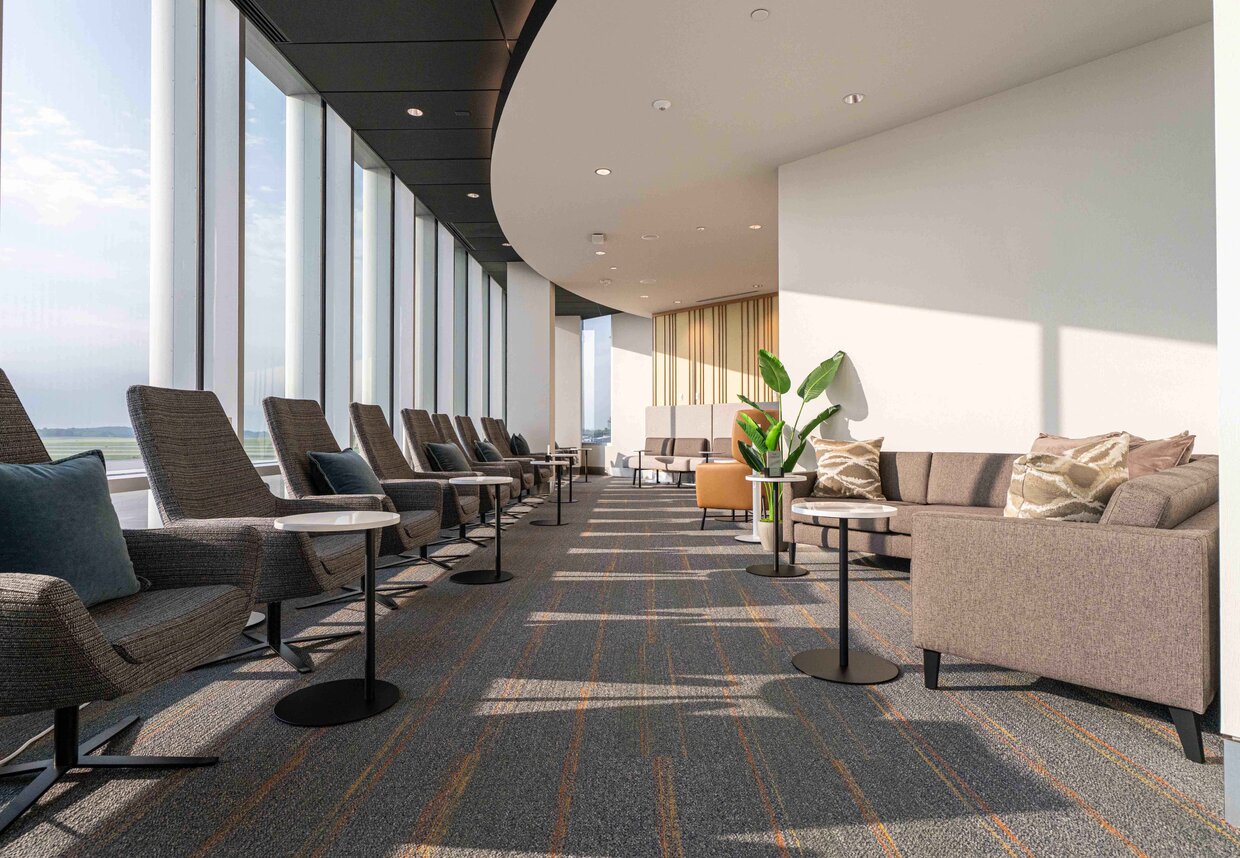 Following our successful completion of The Club MDW in Chicago, our aviation team was selected to deliver a second airport lounge for Airport Dimensions at Gerald R. Ford International Airport in Grand Rapids, MI. The 4,000 sf common‑use lounge, located in Concourse A, features a concourse‑level entry and concierge desk, with a mezzanine level that offers a bar, servery, pantry, and a variety of lounge and productivity areas for travelers.